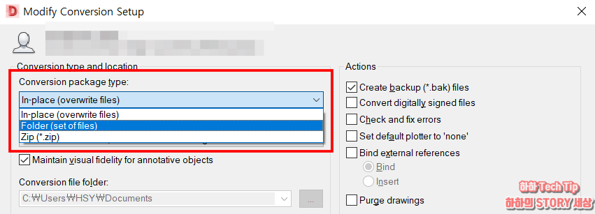 Path options 항목에서 버전이 바뀐 DWG 파일을 저장할 곳을 지정할 수 있다.