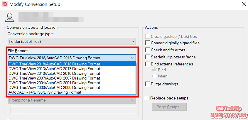 File Fomat 항목은 변경할 AUTOCAD 버전을 선택하는 곳으로 2018, 2013, 2010, 2007, 2004, 2000, R14 포맷이 지원된다.