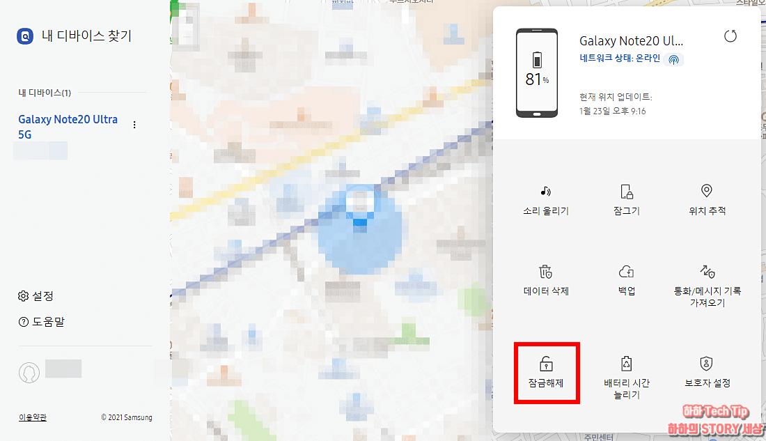 계정에 등록된 내 스마트폰이 확인되며, 사용자의 스마트폰이 다수라면 좌측 내 디바이스에서 PIN번호 등을 풀기 원하는 기기를 선택하면 된다.