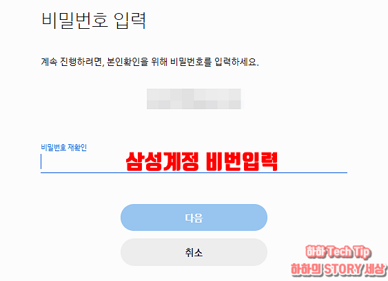 해제 전 비밀번호 입력화면이 나오는데, 삼성 계정 비밀번호를 다시 한번 더 입력하고 다음을 누른다.