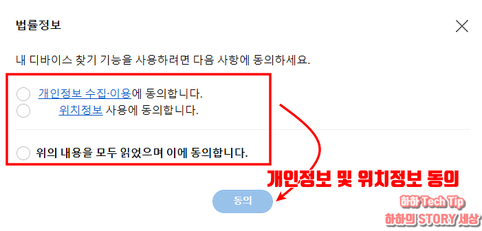 삼성 핸드폰 패턴 풀기 방법은 개인정보와 위치정보 사용을 통해 디바이스를 원격 조정하는 것이기에 두 가지 동의 사항이 필요하니 체크 후 동의를 클릭한다.