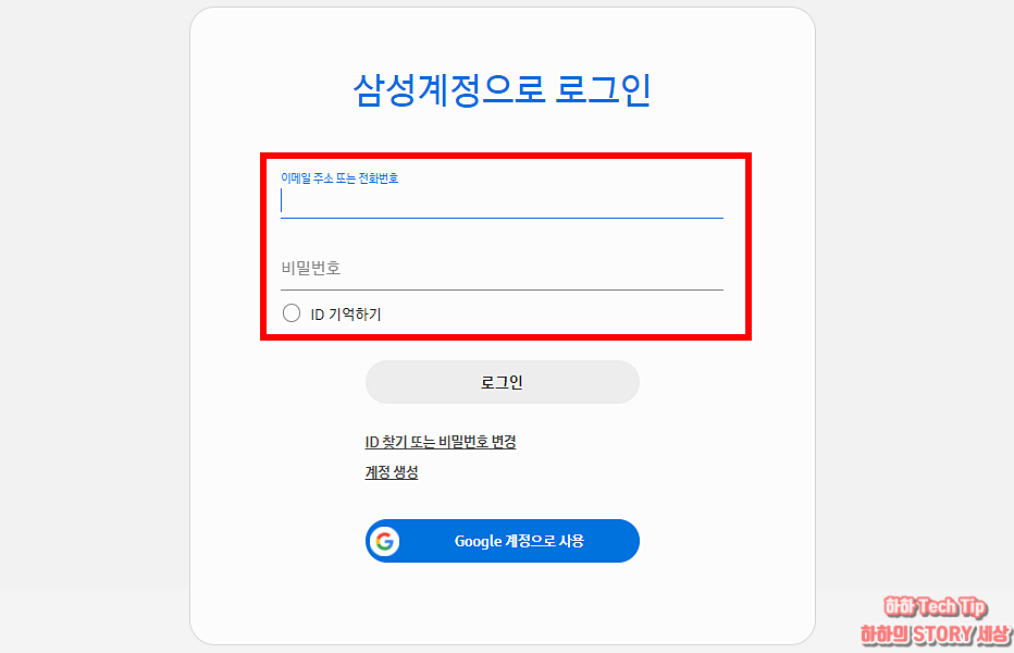 삼성계정 입력 화면이 나타나면 가입 시 입력했던 이메일 주소 또는 전화번호로 로그인하면 되는데, 구글 계정으로도 로그인이 가능하다.