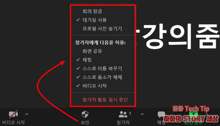 보안은 회의실을 개설한 호스트만 사용할 수 있는 기능으로 대기실, 화면공유, 채팅, 이름 바꾸기 등의 옵션을 활성 또는 비활성화한다.