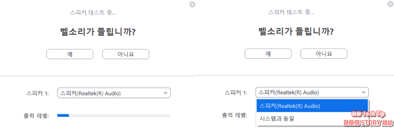 첫번째 스피커 테스트는 소리가 정상적으로 나오는지 확인한다. 만약 소리가 제대로 나오지 않는 문제가 발생한다면 스피커1을 클릭해서 PC에 설치된 외부 스피커, 모니터 스피커, 헤드셋 중 하나를 선택 후 벨소리가 들리는지 확인한다.