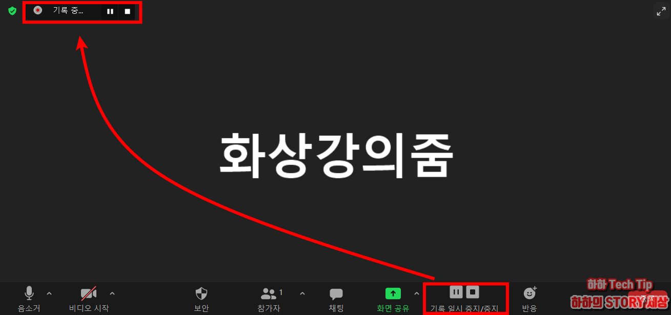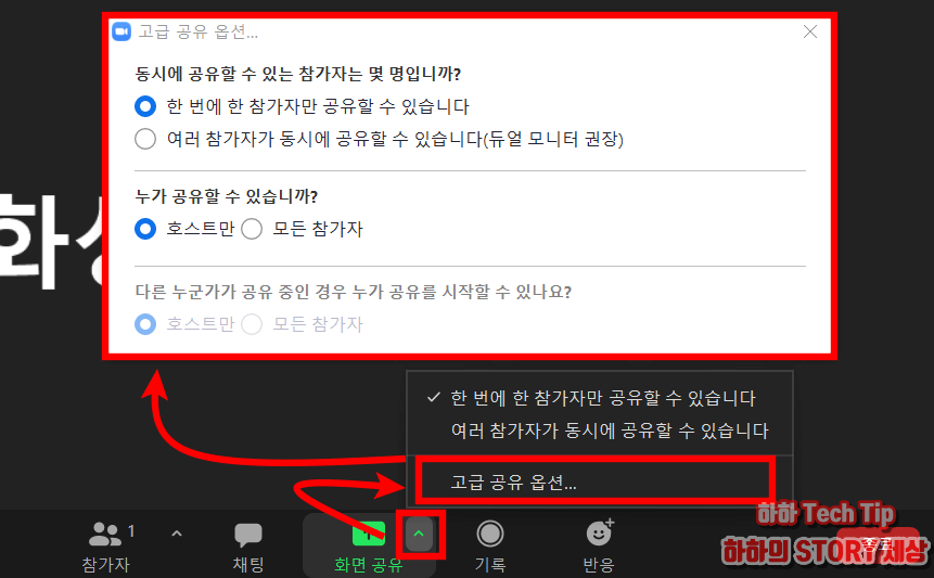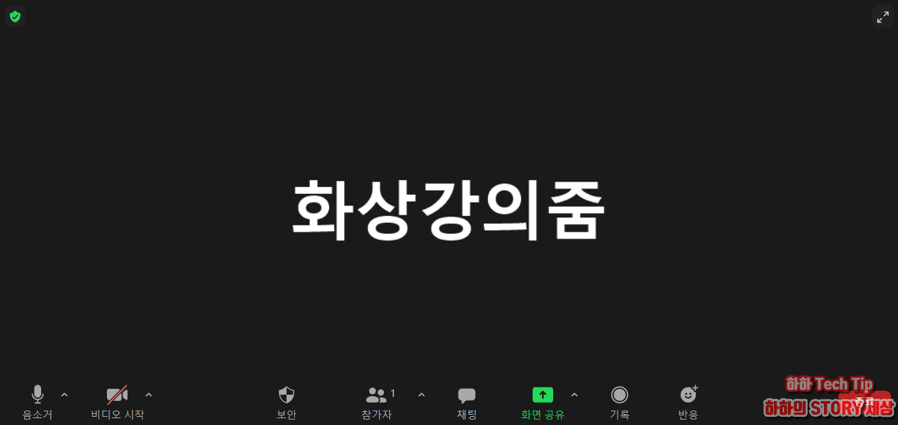 화면공유는 화상회의 중 참여자에게 웹캠을 통하지 않고 어떤 내용을 보여줄 때 사용하는 기능으로 여러 참가자 동시 기능 활성화 시 참여자가 마음대로 화면을 공유할 수 있으니 학생들을 가르치는 선생님이라면 호스트만 공유가 가능하도록 설정한다.