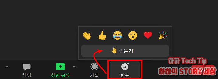 반응은 이모티콘을 화면에 표시 할 수 있는 기능으로 학생이나 참가자가 질문할 것이 있다면 손들기를 클릭하면 된다. 이때 선생님 또는 호스트 화면에는 손들기를 한 참가자 화면에 손들기 아이콘이 나타나며, 손 모양을 클릭하면 아이콘이 사라진다.