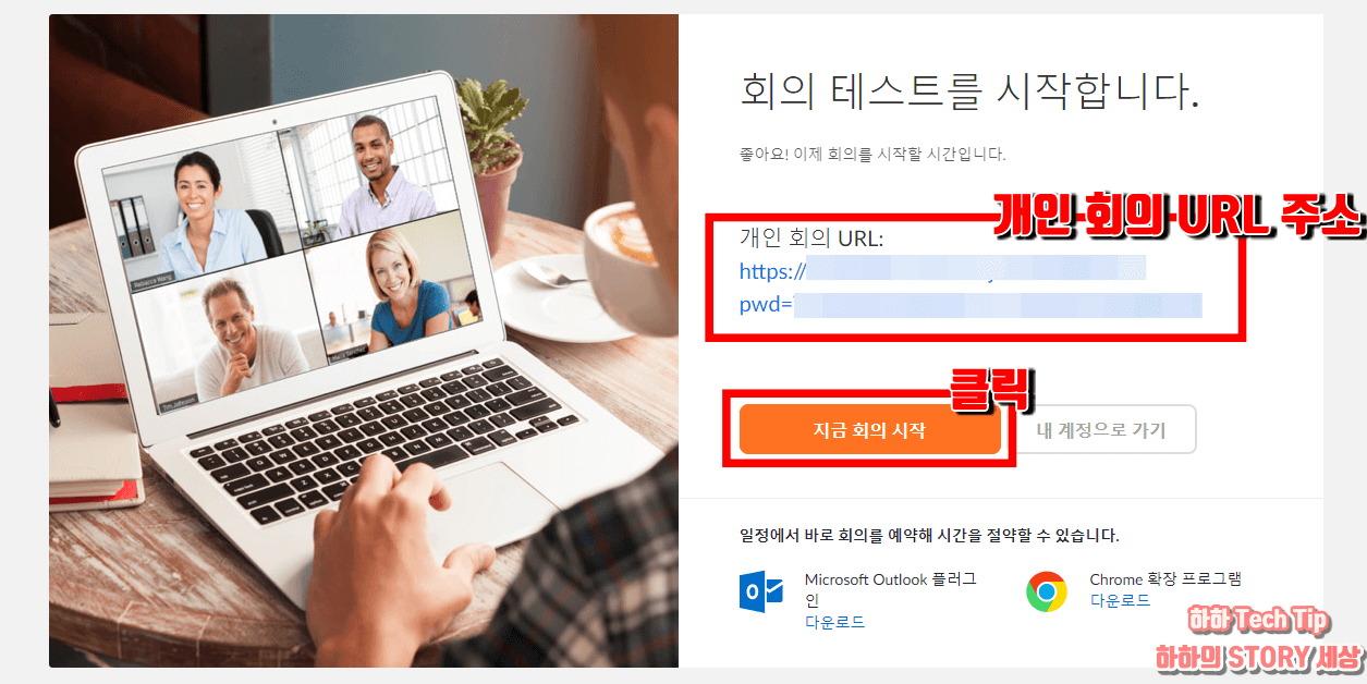 계정 생성이 마무리되면서 회의 테스트 시작화면이 나타난다. 개인 회의 URL은 내가 만든 회의방에 상대를 초대할 때 필요한 것으로 나중에 확인이 가능하니 메모할 필요는 없다.