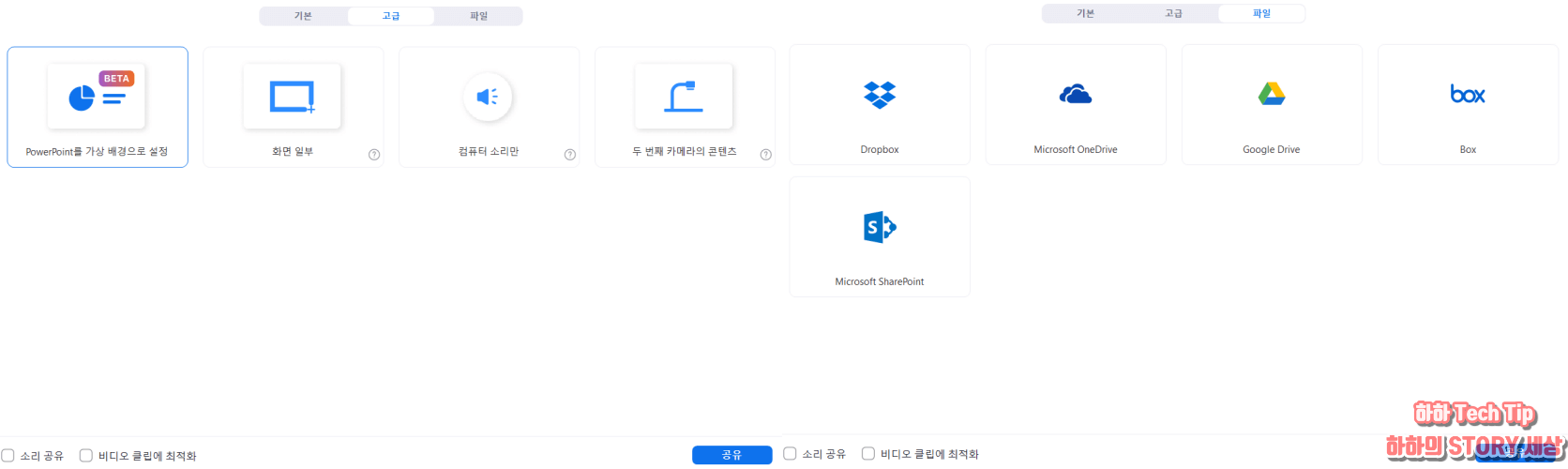 Zoom 화면공유 방법은 크게 기본, 고급, 파일 세 가지 항목으로 분류되는데, 세부적으로는 인터넷 창, 파워포인트, 동영상, 화면 일부, 드랍박스와 같은 클라우드 등에 있는 자료도 보여줄 수 있다.