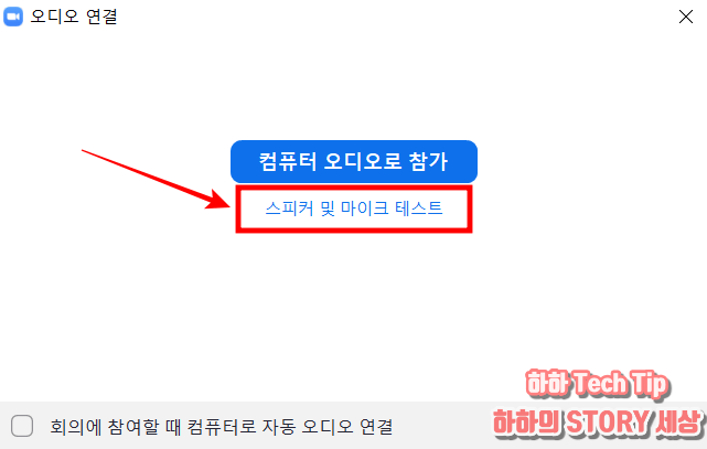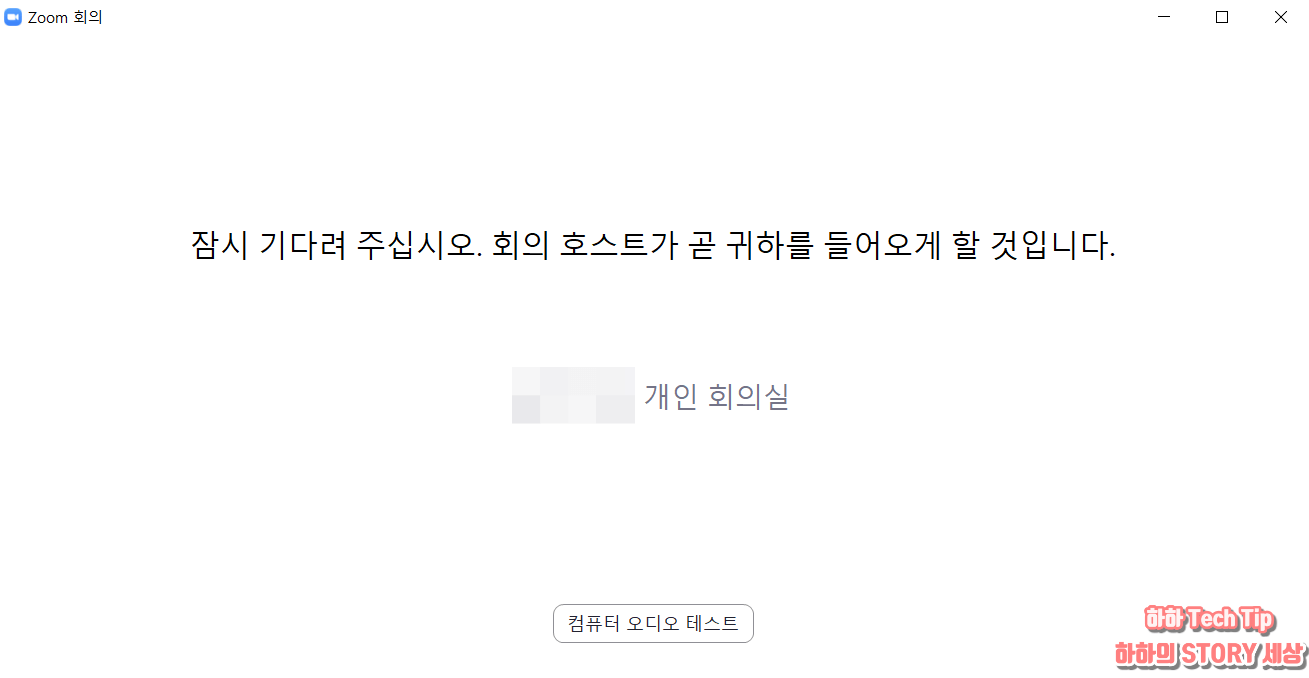 회의실 입장 직전 스피커와 마이크 테스트를 위한 창이 나타난다. 컴퓨터 오디오로 참가를 누르면 회의실 대기가 시작되는데, 호스트가 승인하기까지 얼마간의 시간이 있기에 이왕이면 미리 테스트해서 수업에 즉시 참여 하도록 하는 것이 좋다.