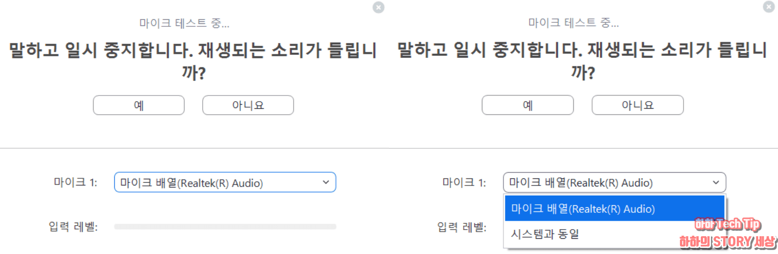 두 번째 마이크 테스트는 화상회의에서 가장 중요한 상대방과 의사소통을 위한 것으로 기기 쪽으로 말을 하면 입력 레벨 게이지가 변화한다. 소리 입력 후 스피커로 들리지 않으면 마이크1을 클릭해 다른 디바이스로 변경해 확인한다.
