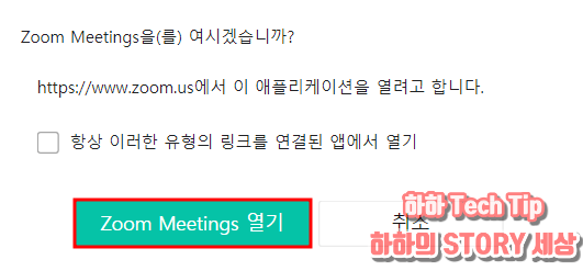 처음 접속이 컴퓨터라면 안내에 따라 줌 프로그램 설치 후 Zoom Meetings 열기를 클릭하고 핸드폰에서는 줌 어플을 선택한다.