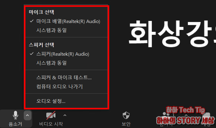 음소거 아이콘 화살표를 누르면 마이크, 스피커, 기기 테스트 등이 나타나고 오디오 설정을 통해 배경 소음 억제 등 좀 더 다양한 조작이 가능하다.