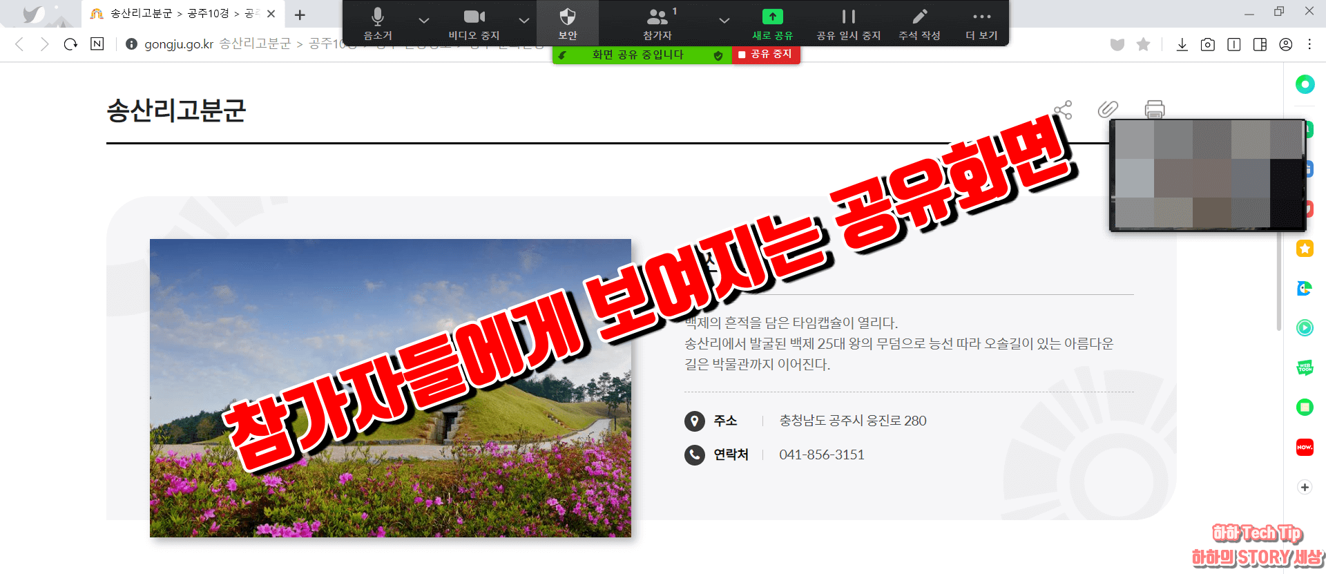 기본 탭에서 화면을 선택해 인터넷 브라우저로 찾은 유적지를 참가자에게 보여주는 모습이다. 화면이 공유되는 동안 상단 창에는 화면 공유 중입니다 안내가 나타난다.