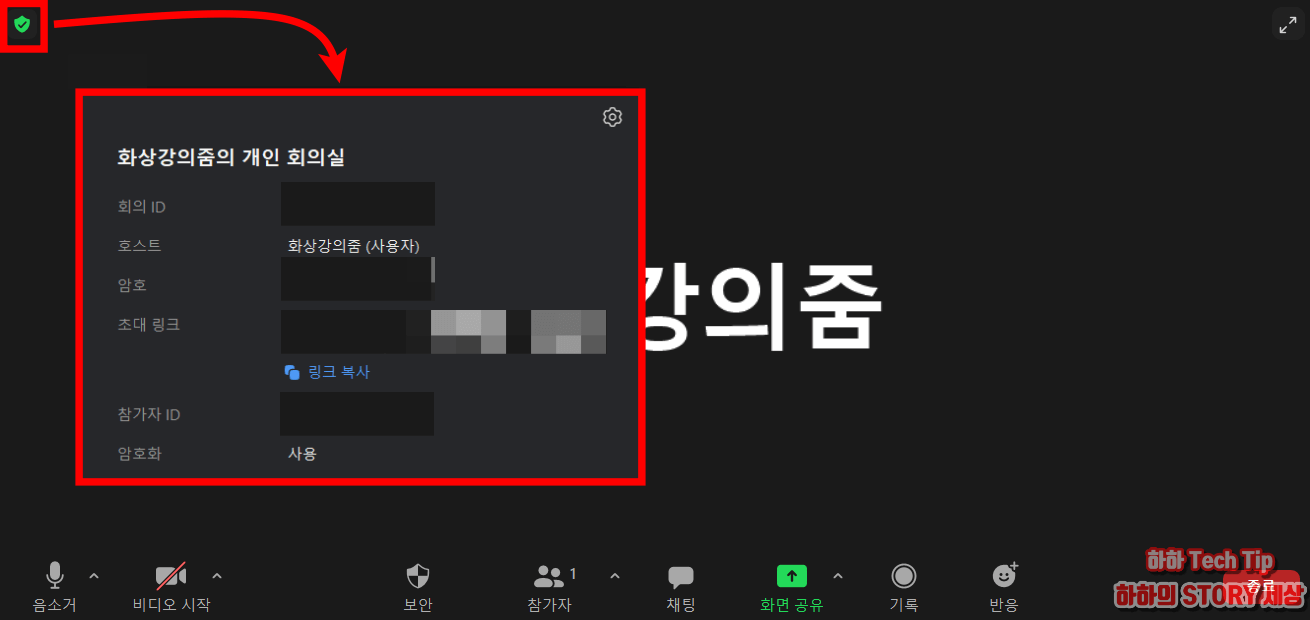 Zoom 회의 만들기 완료 또는 수업에 입장하면 화면과 같은 창이 나타난다. 좌측 상단 방패모양을 클릭하면 현재 입장한 회의실에 대한 ID, 호스트, 암호, 초대 링크, 참가자 등의 정보를 알 수 있다.