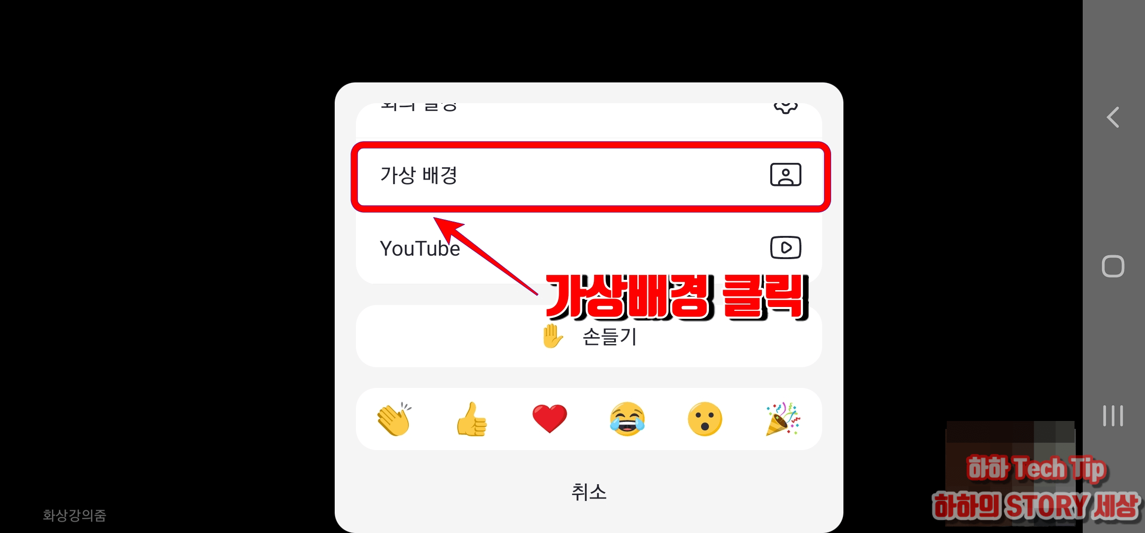 핸드폰에서 변경하는 방법은 우측 하단에 더보기를 클릭 후 아래로 스크롤해서 가상배경을 선택한다.