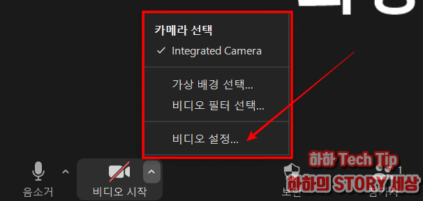 비디오 기능은 비활성 상태로 시작되고 비디오 시작 화살표를 누르면 카메라, 가상 배경 등 선택이 가능하고 세부 설정을 비디오 설정에서 할 수 있다.