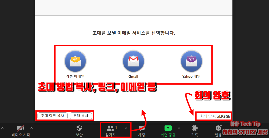 초대를 할 때는 반드시 우측 하단에 보이는 회의 암호를 함께 보내주어야 입장이 가능하다.