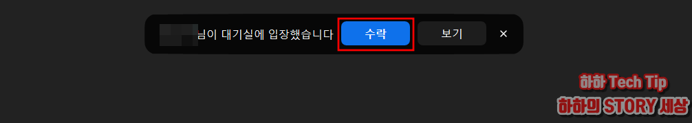 초대할 사람들에게 회의 ID, URL, 회의실 암호 배포 후 화상수업에 참여하게 되면 대기실에 입장했다는 안내가 표시된다. 초대한 사람이 맞다면 수락을 눌러 회의실에 입장시킨다.
