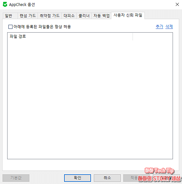 악성코드나 바이러스에 감염되지 않았지만 앱체크에서 허용하지 않는 파일이 있는 경우 창 우측에 보이는 추가를 통해 신뢰 파일로 지정한다.