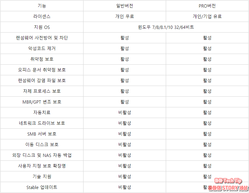 유료 라이선스 프로와 일반 기능 차이는 아래와 같다.