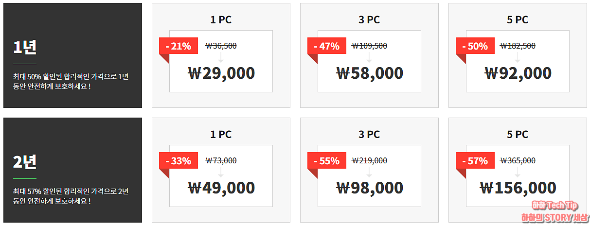유료는 1년 및 2년 단위로 구매가 가능하고 1~5대까지 할인이 적용되어 1년 1PC 사용 시 29,900원, 5PC 92,000원 요금이 부과된다.
