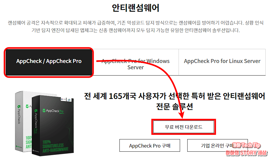 앱체크는 개인 유저가 사용할 수 있는 버전과 리눅스나 윈도우 서버에서 쓰는 전용 버전이 존재하며, 일반 사용자라면 무료 버전 다운로드 배너를 클릭한다.