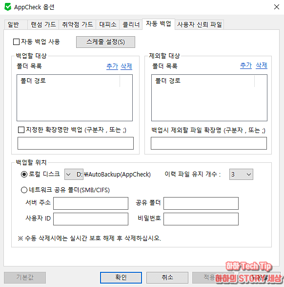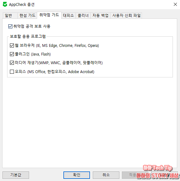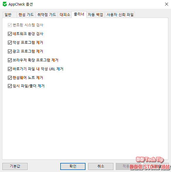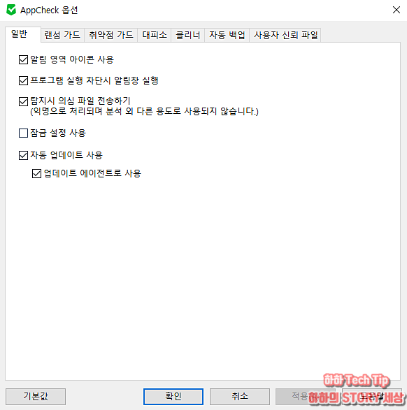 바이러스 등에 의한 프로그램 실행 차단 시 알림 창 표시는 앱체크 감염 여부 확인을 위해서 꼭 활성화 둔 상태로 두어야 하며, 최신 상태 유지를 위해 자동 업데이트를 체크한다.