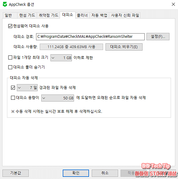 랜섬웨어 감염 의심이 있는 파일을 대피소로 백업하며, 저장 파일이 더 이상 필요 없을 때 대피소를 비우면 된다.