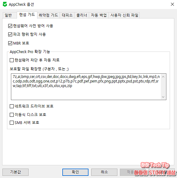 프로그램 작동에 관한 옵션을 설정할 수 있는 곳으로 일반, 랜섬가드, 등 7가지 탭으로 구성된다.