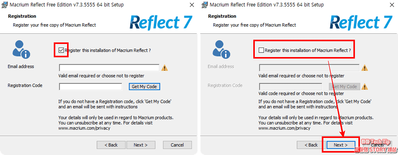 리플렉트 7 툴 등록을 위한 이메일 입력 화면이 다시 등장하는데, 무시하고 넘어가려 해도 클릭이 되지 않는다. 이때, 상단 Register this installation of Macrium Reflect? 체크박스를 해제하면 Next 버튼이 활성화되니 다음 단계로 이동한다.