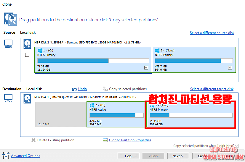 Source 파트에는 윈도우 영역이 두 개로 표시되는데, 첫 번째는 윈도우 OS가 설치된 드라이브고 두 번째 부분은 윈도우 복구 영역이 할당된 부분으로 내 컴퓨터 폴더에서는 보이지 않아 모르는 경우가 많다.