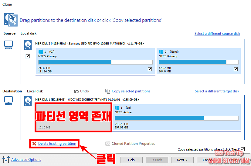 복사될 저장장치가 선택되면 Destination 항목에 표시되며, 화면처럼 파티션 영역이 나타나는 경우 왼쪽 아래에 보이는 Delete Existing partition 기능을 클릭해 파티션 영역을 삭제할 수 있다.