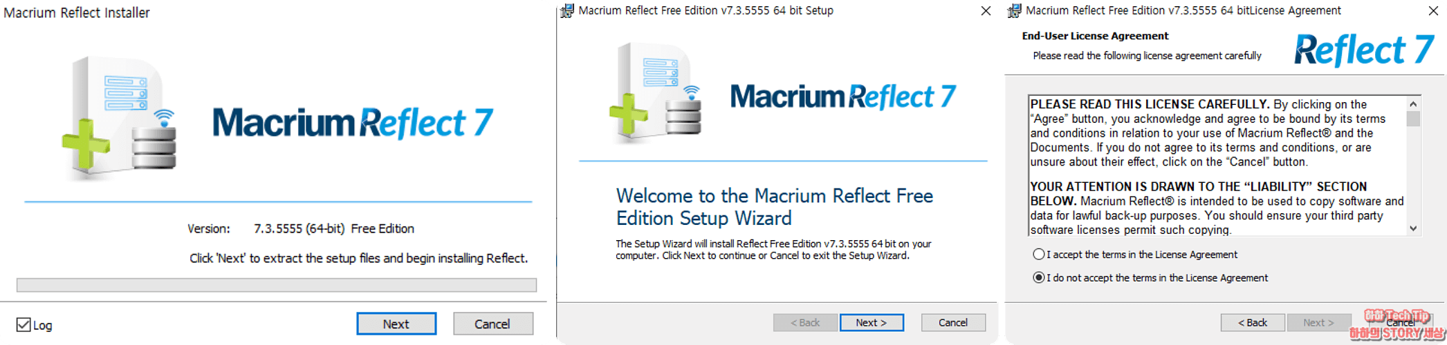 패키지 다운 후 자동으로 설치 화면으로 변경되면 Next를 누른다. 맥리움 리플렉트 7 설치 마법사 창에서 Next를 클릭 → 라이선스 동의 → 라이센스 선택
