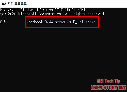 화면에 bcdboot [신규 드라이브 이름]:\Windows /s [신규 드라이브 이름]: /l ko-kr 을 입력한다. 신규 드라이브 이름에는 복사된 SSD에게 부여된 영어 드라이브가 D라면 신규 드라이브 이름을 화면처럼 D로 입력하면 된다.