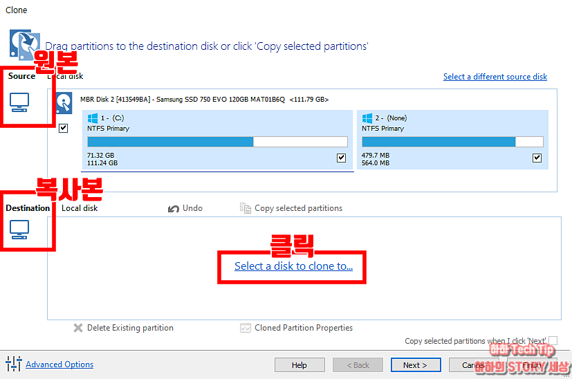 클론 창은 원본 SSD 디스크인 Source 파트와 복사대상 디스크인 Destination 항목으로 구분되며, 원본을 복사할 디스크 선택을 위해 Select a disk to clone to 부분을 클릭한다.