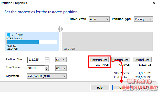 Partition Properties 창에서 파티션 사이즈를 설정할 수 있는데, 남은 용량을 하나로 통합 할 것이니 Maximum size를 클릭한 후 Ok를 누른다.
