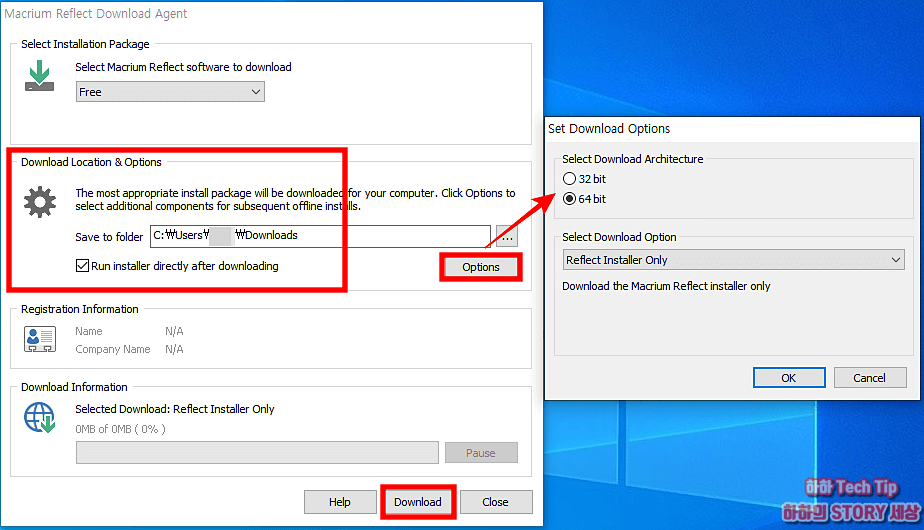 다운된 ReflectDLHF.exe 파일을 실행하면 Download Agent 창이 생성되며, 설치 패키지를 받을 폴더를 지정하게 된다. 패키지 환경은 64비트로 설정되어 있으니 운영체제가 32비트라면 Options 클릭 후 Select Download Architecture에서 변경한다.