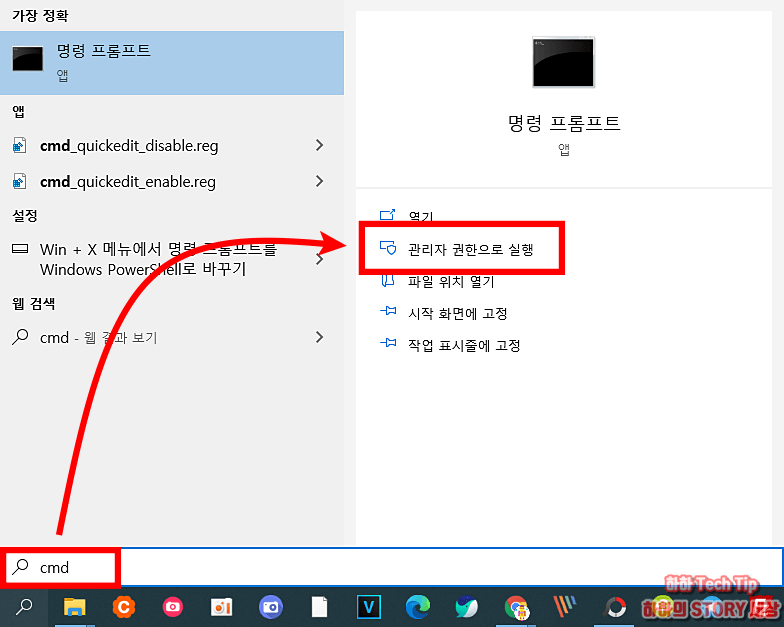 부팅 순서를 보다 좀 더 편하게 잡는 방법이 있는데, 바탕화면 작업 표시줄에서 검색(돋보기)을 클릭하여 cmd를 입력 후 명령 프롬프트 앱을 관리자 권한으로 실행한다.
