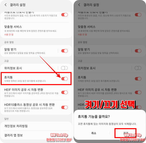 갤러리 설정 화면에서 고급 카테고리로 이동 후 휴지통 항목 스위치를 클릭한다. 향후 기능 사용을 원치 않다면 끄기를 선택해 비활성 하면 된다.