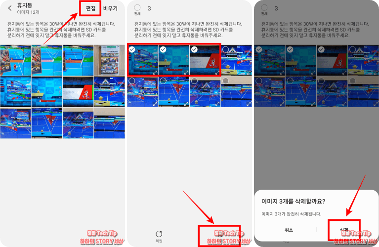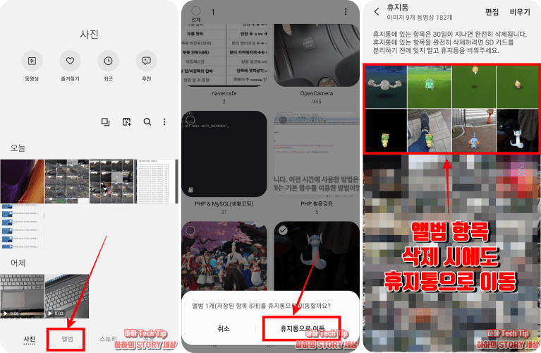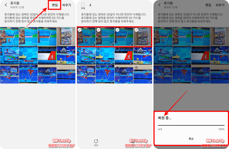휴지통에는 방금 삭제한 사진이나 영상을 볼 수 있는데, 보관된 미디어들은 30일까지 저장되고 그 이후에는 핸드폰 저장소로부터 완전히 삭제되니 복원할 것이 있다면 그 이전에 시행해야 한다.