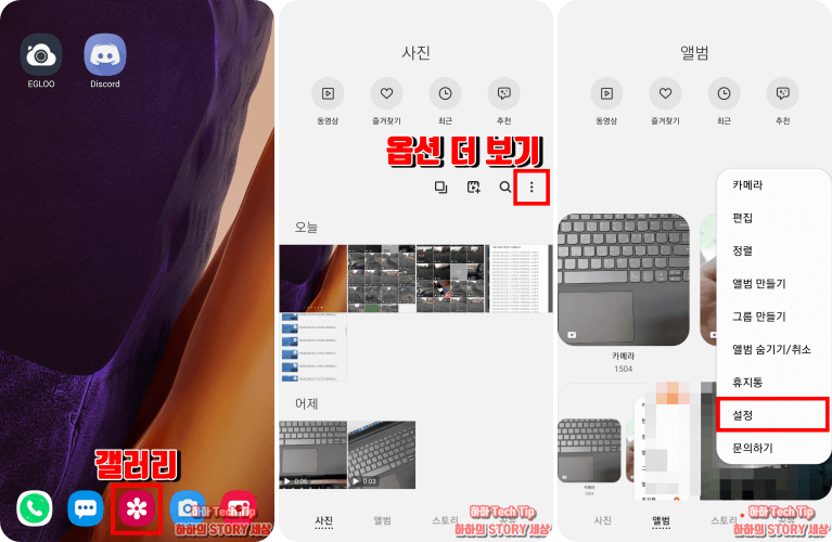 휴지통 스위치를 켜기 위해 갤러리 실행 → 옵션 더 보기 → 설정 순서로 이동한다.