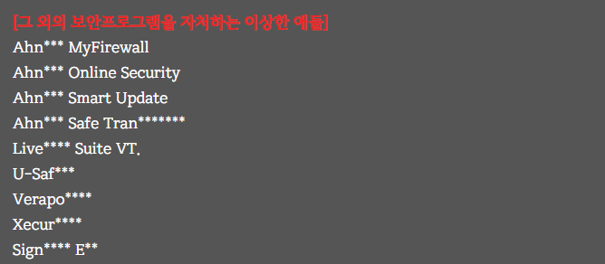 대표적인 금융 보안 툴인 AnXXX 외에 PC에 설치되었는지도 몰랐던 각종 툴들이 나타나는데, 만약 자신이 은행 관련 일로 PC 뱅킹 업무를 매일 해야 한다면 방문시마다 프로그램 설치로 시간이 낭비되므로 이때는 선택에서 제외하는 것이 좋다.