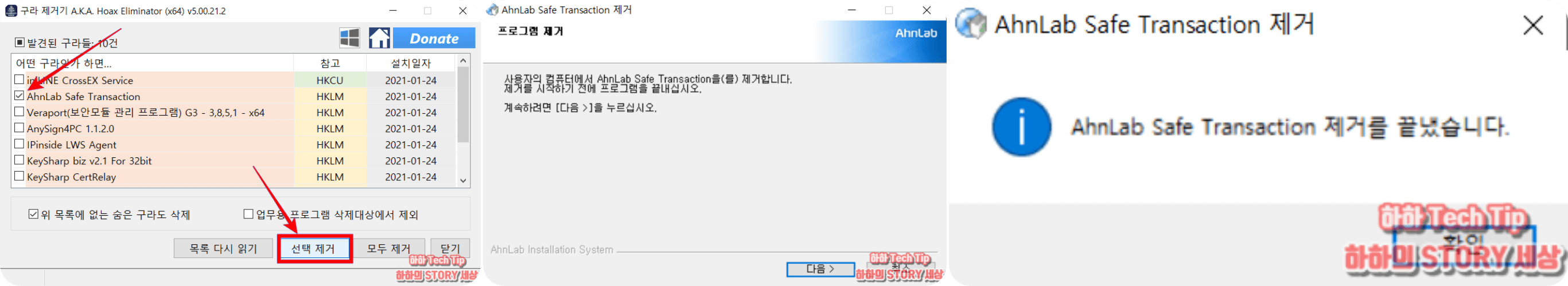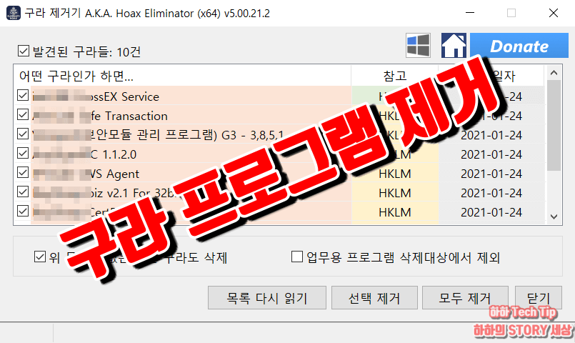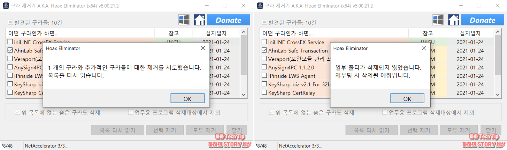 제거할 것들을 정했다면 아래에 보이는 선택 제거 또는 모두 제거를 클릭한다. 설치된 툴에 따라서 제어판 프로그램 제거 화면이 실행되거나 구라제거기가 직접 제거되는데, 화면 안내대로 진행하면 된다.