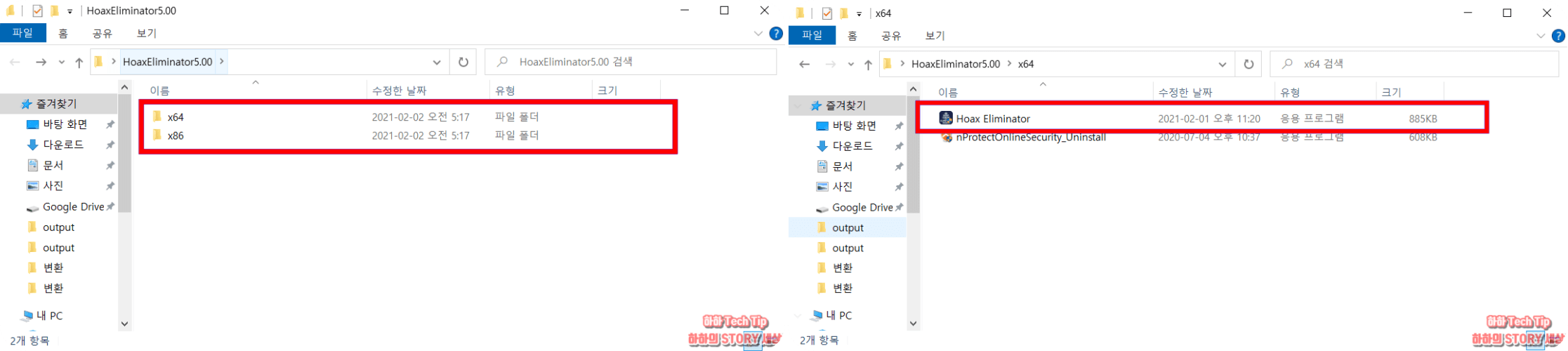 압축이 해제된 HoaxEliminatorX.XX 폴더 중 자신의 시스템 환경에 따라 32비트는 x86, 64비트는 x64를 선택한다. 만약 몇 비트인지 잘 모른다면 내 컴퓨터 사양에서 확인 할 수 있다.