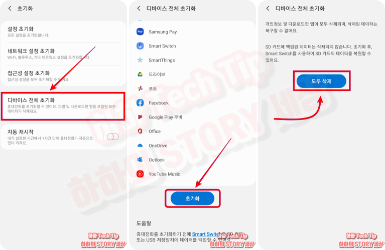 디바이스 전체 초기화 → 초기화 선택 → 패턴 확인 → 모두 삭제