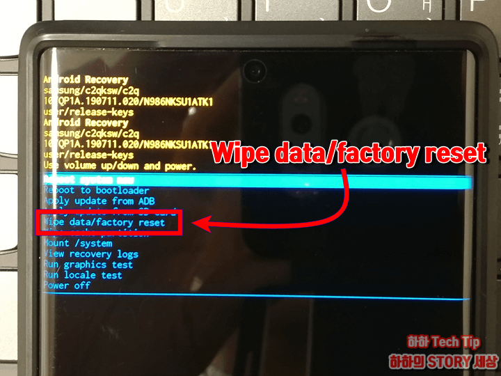 4. 안드로이드 복구 화면이 나타나면 안드로이드 복구 창에서 파란색 메뉴 중 Wipe data/factory reset 부분을 클릭한다.