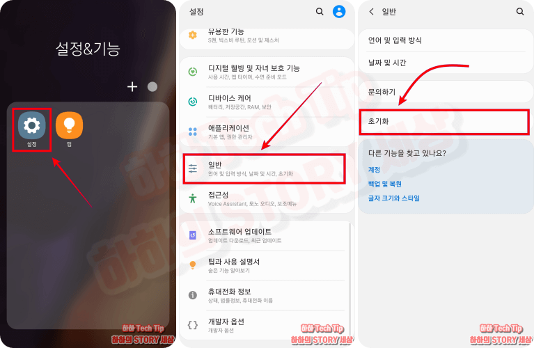 설정 어플리케이션 실행 → 일반 항목 → 초기화 선택