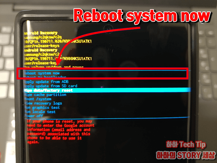6. 초기화가 끝나면 처음 안드로이드 리커버리 화면으로 돌아오는데, Reboot system now를 선택해서 핸드폰 리부팅 후 핸드폰 초기 설정을 하면 모든 작업은 완료된다.