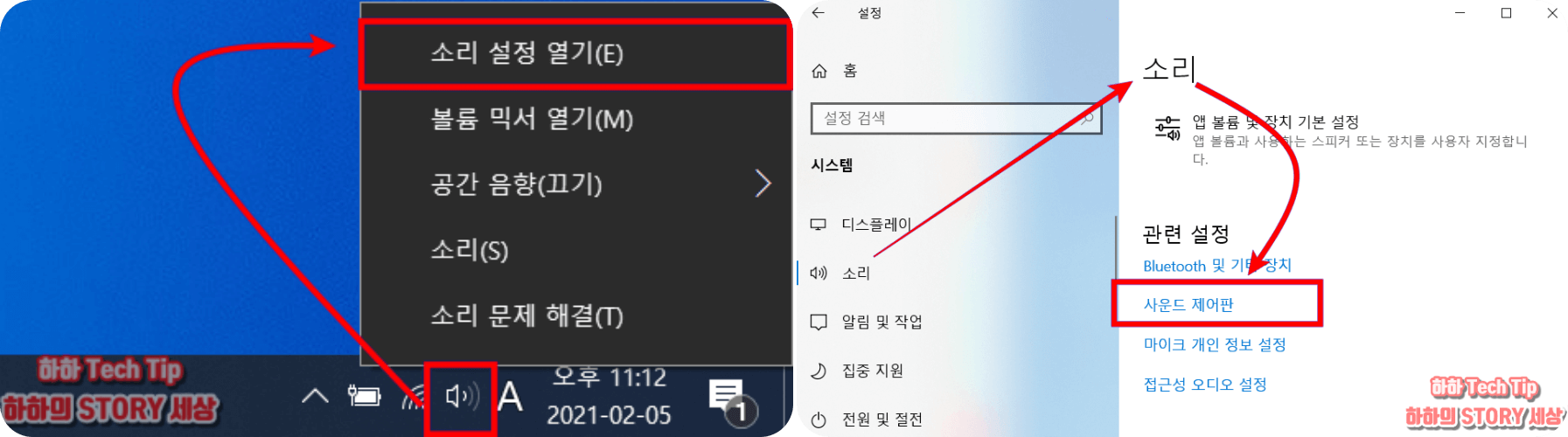 소리 설정 창에서 마우스 스크롤 하여 사운드 제어판을 클릭한다.