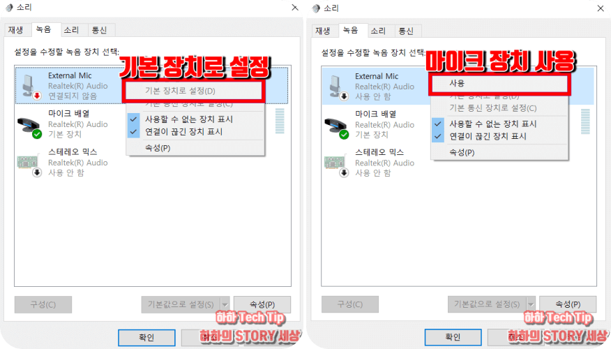 소리 제어창이 나타나면 녹음 탭으로 이동 후 마이크 부분을 사용으로 설정하고 그래도 들리지 않을 시 기본 장치로 설정을 선택하면 해결된다.